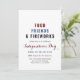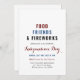 Cette invitation à la fête de l'indépendance d'amies et feux d'artifice est parfaite pour une fête 4 juillet. Le design comporte une police de calligraphie élégante en noir, bleu et rouge.