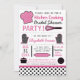 Les invitations à la cuisine de la cuisine moderne à la douche nuptiale à thème comprennent la typographie, les accessoires et les ustensiles de cuisine, et les motifs à points de polka dans un décor noir, rose et blanc.