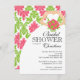 Une mariée élégante et chic tenant un bouquet floral de fleurs couleur rose chaud et vert citron portant une robe blanche mariage posée sur un arrière - plan damassé vert & rose moderne. Notre invitation branchée à la nuptiale vous offre un retour pour cette touche spéciale. Visitez notre boutique pour voir cette faire-part de mariage populaire dans un grand choix de arrière - plans pour une douche de marée de printemps élégante, une douche de nage d'été, une douche de nage d'automne, une douche de nage d'hiver, une douche de nage d'automne.