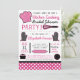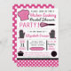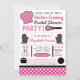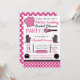 Les invitations de fête de mariage sur le thème de la cuisine moderne présentent une typographie, des accessoires et ustensiles de cuisine, ainsi que des motifs à pois dans une palette de couleurs noir, rose et blanc.