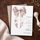 Une invitation pour une baby shower en forme de ruban coquette toile rose comportant une illustration élégante de nœud inspirée de l'époque vintage qui apporte une touche romantique douce à la célébration. L'œuvre d'art délicate du ruban associée à une typographie classique crée un look gracieux qui se sent à la fois intemporel et élégant pour accueillir une petite fille. Inspiré par l'esthétique coquette populaire et les motifs traditionnels de toile, ce design porte une qualité d'héritage doux qui fonctionne magnifiquement pour des baby showers charmantes. Un choix charmant pour les hôtes qui prévoient une baby shower pour une petite fille, une réunion inspirée de l'époque vintage ou une célébration rose sucrée où l'élégance féminine et le style de livre d'histoires classique se réunissent. Disponible en version imprimée, en téléchargement numérique ou les deux.
