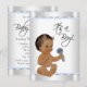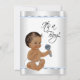Invitation à une fête de naissance d'un bébé garçon ethnique avec un adorable bébé garçon ethnique sur un beau fond argenté et bleu bébé. Vous pouvez facilement personnaliser cette élégante invitation à une fête de naissance bleu et argenté en ajoutant simplement vos détails dans le style de police de votre choix.