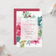 Cette invitation à la fête d'hiver mariage de Noël élégante et élégante présente un bouquet floral à l'aquarelle branché sur un arrière - plan blanc immaculé. Un mélange de fleurs de poinsettia, de baies sèches et de feuilles est coloré dans des tons festifs de rouge, rose, vert, roux et bleu avec un script manuscrit moderne assorti. Le fond de l'invitation est un rouge rose et coloré.