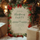 Un design festif de Noël encadré de poinsettias rouges classiques, branches de pin et verdure d'hiver. Le style rustique vintage saisit la chaleur et le confort de la période des fêtes, parfait pour une fête traditionnelle de Noël.