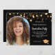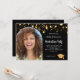 Ajoutez votre propre photo verticale du diplômé. Un cadre photo en arc. Une couleur arrière - plan noire classique, décorée de faux étoiles dorées. Personnalisez et ajoutez un nom et des détails du parti.