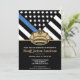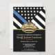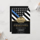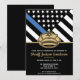 Ce design présente un drapeau de la force de police avec des bandes noires et blanches, ainsi qu'une fine bande bleue. Le chapeau de policier et le texte doré se trouvent au-dessus de tous les détails de la fête pour la retraite de l'agent de la force de l'ordre, du shérif, du capitaine ou du chef en retraite.