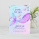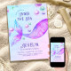 Invitation à la fête d'anniversaire de la Sirène avec la queue magique de la sirène et la typographie décorative. Le design est composé d'une queue de sirène et de bulles océaniques dans des tons d'aquarelle violet rose vert et bleu. Facile à éditer pour n'importe quel âge et parfait pour la fête de sirène, la fête de la piscine, la princesse girly et sous les thèmes de la mer.
