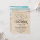 Cartes d'invitation de fiançailles BBQ de destination de plage avec un fond d'île tropicale estivale, les mots "I DO BBQ" avec une alliance comme lettre "O", deux cœurs dessinés à la main sur le rivage sablonneux, vos initiales et un modèle de fête de fiançailles.