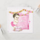 Joli fond de perle rose avec des banderoles roses et dorées et de délicieuses invitations de fête de premier anniversaire de bébé fille vintage. Cette invitation de fête de premier anniversaire rose est facilement personnalisable pour votre événement en ajoutant vos détails dans le style de police et la couleur, la formulation et la mise en page de votre choix.