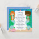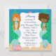 Cette belle invitation à la fête d'anniversaire en bord de mer présente deux sirènes, une sirène ethnique à la peau foncée et aux cheveux, et une sirène aux cheveux rouges en tresses. Les sirènes nagent dans l'océan. Cette invitation de sirènes inclut du texte personnalisé pour la personnaliser. Quelques graphiques par AMBillustrations.