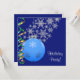 C'est une jolie invitation à la fête de Noël qui présente une ampoule d'arbre de Noël bleu clair contre un ciel bleu royal foncé. Une douche de flocons d'argent tombe derrière l'ampoule, et des brins de ruban dorés, bleus, verts et dorés ornent le côté gauche. Le verso de l'invitation est assorti au bleu avec vos informations de fête. Facile à customiser, élégant et festif !