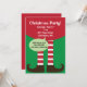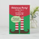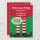 Cette mignonne invitation à la fête de Noël présente la moitié inférieure de l'un des elfes de Père Noël portant des bas rouges et blancs et des chaussures noires.