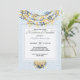 Ce joli design présente des couronnes de branches bleu marine et des feuilles avec de petites fleurs d'or, un motif de points bleu aquarelle, et, à l'envers, un motif de menorah doré et l'Étoile de David. La typographie élégante est une combinaison de script moderne et de bloc moderne. La couleur arrière - plan bleu pastel peut être modifiée en choisissant l'option personnaliser. #Hanoukka #Invitations #Vacances