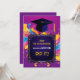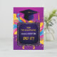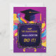 L'invitation éclate d'une émeute de couleurs vives, allant des violets et des roses joyeux aux jaunes ensoleillés et aux bleus éclatants. En haut de la page se trouve un casquette en carton bleu foncé, ajoutant une touche de charme érudit au milieu du chaos coloré. La légende donne le ton d'une fête animée, invitant les invités à se joindre aux festivités avec une touche d'humour et de camaraderie. Au dos, contre un arrière - plan violet audacieux, le texte de l'invitation attend. Les détails essentiels de l'événement sont présentés dans un texte ludique et coloré, assurant que les clients sont bien informés tout en maintenant l'esthétique ludique et dynamique de l'invitation. Dans l'ensemble, cette invitation promet une célébration remplie de rire, de joie et de souvenirs inoubliables, capturant parfaitement l'esprit de l'occasion dans toute sa gloire colorée.