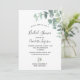 Un arrière - plan blanc chic. Décoré de verdure blanche d'eucalyptus, de feuilles et de sprigs. Personnalisez et ajoutez un nom et des détails du parti. Lettres noires. Le texte : la Fête des mariées et le nom de la mariée sont écrits avec un script de style manuscrit moderne. Dos : couleur arrière - plan verte.