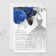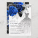 Belle invitation à la douche nuptiale à fleurs bleu royal, noir & argent avec une robe mariage glamour. Retournez notre invitation wedding shower pour voir un dos à floral de coordination pour une touche spéciale supplémentaire