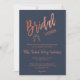 Créez une Fête des mariées personnalisée et splendide, chic et minimaliste pour les futurs mariés. Cette invitation à la douche nuptiale présente un script de calligraphie spacieux et magnifique écrit en feuille d'or rose faux et avec un arrière - plan bleu marine. Vous pouvez facilement le customiser avec votre propre texte et le customiser à votre goût. Veuillez noter : "Bridal" et "-Shower-" et "-The-" "Details" et l'illustration en verre de champagne ne peut pas être modifiée. Remarque supplémentaire : L'impression de feuille d'or rose est un effet de feuille d'or rose faux. Ce n'est PAS la feuille d'or rose d'estampillage à chaud.