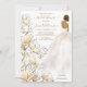 Magnifique mariée à l'aquarelle dessinée à la main avec la peau foncée et les cheveux dans sa robe mariage et entourée de magnolias. Le dos de l'invitation comporte des anneaux mariages dans la boîte avec les initiales de la mariée et du marié.
