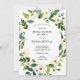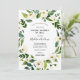 Longue distance Fête des mariées par mail invitation avec des branches de verdure aquarelle et des fleurs blanches qui balaient les coins du design. Personnalisez avec vos informations ou cliquez sur "Cliquez pour customiser plus loin" pour modifier les styles, la taille et les couleurs des polices.