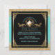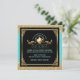 Elégante invitation à la fête de thé nuptiale en bleu et or joli- Center est un cadre de cercle métallique à l'apparence dorée avec des rouleaux de feuilles et un look vintage, aquarelle fleurie théière. Ci-dessous, le nom de la mariée dans le style Art déco, le lettrage bleu bleu vert et les détails personnalisés de la douche de mariage, y compris RSVP et les informations de registre du magasin. Contre un arrière - plan noir avec parties scintillant en faux or et bords bleus. Faux cadre d'aspect métal or antique avec les coins de défilement. Le dos a un arrière - plan bleu coordonné avec une empreinte florale plus légère. Invitations uniques et belles nuptiales bleues et or nuptiales de douche à midi. Nous coordonnons les enveloppes bleues et dorées dans notre boutique Zazzle.com/angela65*, ainsi que d'autres invitations nuptiales à la fête du thé dans la douche.
