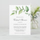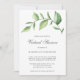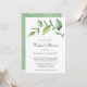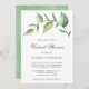 Une invitation à la douche de nuptiale virtuelle rustique pour quand vous ne pouvez pas vous réunir en personne. Invitation présente un design simple avec une aquarelle verte peinte avec de grands feuilles, sur un arrière - plan blanc. Vous trouverez ci-dessous les détails de votre événement dans un gris doux et le côté arrière a un lave-aquarelle vert clair. Un design botanique élégant qui est parfait pour une fête en été.