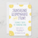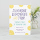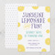 Cette amusante invitation de fête d'anniversaire comprend des tranches de citron et le texte Sunshine Lemonade et Fun. Cet invitation est parfait pour la fête d'anniversaire du stand de limonade d'été de votre petit ! ! !