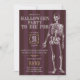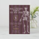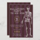 Ce design présente un papier peint à rayures violet foncé avec un grand squelette et une typographie sophistiquée. Facile à customiser avec vos infos de fête.