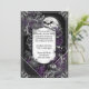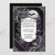 Une chauve-souris, une pleine lune, des toiles d'araignée et des citrouilles se combinent sur une élégante invitation à la fête d'Halloween en noir et blanc.