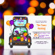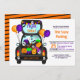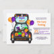 Trunk ou traiter la fête ! Célébrez votre Halloween éffrayant et vos amis invitations et votre famille à votre événement annuel avec cette jolie voiture dessinée à la main avec le coffre plein de bonbons d'Halloween, fantôme, bonbons, ballons, chauves-souris, araignées, citrouille en orange, violet.