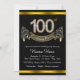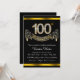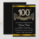 Invitation à une fête de 100 ans avec des chiffres et une bannière en diamants sur un beau fond noir et or riche. Cette belle invitation de 100e anniversaire noir et or est facilement personnalisable pour votre événement. Vous pouvez changer la couleur de fond. Ce design saisissant convient aussi bien à un homme qu'à une femme. Il s'agit d'un design imprimé sans vrais diamants, argent, paillettes, etc.