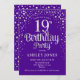 Invitation de fête du 19e anniversaire. Design élégant en violet et faux argent parties scintillant. Comprend des polices de caractères et des confettis stylisés. Message-moi si vous avez besoin d'âge personnalisé.