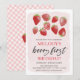 Cette invitation pour la fête du 1er anniversaire de fraise présente des fraises originales peintes à la main à l'aquarelle sur un fond rose clair.
