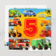 Neuf camions colorés encerclent un grand nombre 5 ! Ajoutez votre âge et votre nom ! Un mélangeur de ciment vert et jaune, un pick-up bleu, un bulldozer jaune, un camion à benne orange, un rouleau routier rouge, un tracteur vert et une remorque, un grand camion-feu rouge, un excavateur jaune et un camion rouge de constructeur! Toutes sortes de transports, les gros camions que les enfants aiment ! Sur un arrière - plan bleu et jaune vif qui fait une invitation ou faire-part très colorée et amusante. Idéal pour votre camion de pompier, de creveur, de camion ou de tracteur de 5 ans à son 5e anniversaire. Merveilleux pour la fête d'anniversaire à thème de votre enfant de 5 ans. Les enfants adorent les camions, les camions, les camions et les camions et les enfants de 5 ans les aiment vraiment ! Construction moderne pour enfants et camion thème anniversaire fournitures, accessoires, faveurs de fête et cadeaux. Tous les dessins et illustrations de camions © Paul Stickland