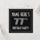 L'avant de ce style design des années 1920-1930 a inspiré soixante-dix-septième anniversaire et la conception de la carte d'invitation à la célébration comprend un nom modifiable, un style art déco fantaisie inspiré du numéro "77th", le message "BIRTHDAY PARTY !", et un motif frontalier composé de lignes. Il y a un arrière - plan de couleur noire sur le devant par défaut, mais il peut être customisé à une couleur différente si désiré. Le verso présente des détails personnalisés sur l'événement, tels que la date, l'heure, le lieu/lieu et toute autre information qui peut être importante. Des invitations luxueuses, élégantes et personnalisables comme celles-ci pourraient être utilisées pour des invités invitations à une fête d’anniversaire qui se tient pour honorer le 77e anniversaire de quelqu’un. [~Z0000615]