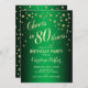 Invitation de fête du 80e anniversaire Design élégant avec fausse parties scintillant or et vert. Comprend des polices de caractères et des confettis stylisés. Salut à 80 ans !