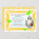 Les invitations à la Fête du Thé du Jardin à l'avant présentent un cadre français assez vintage en papillons jaunes et verts et une théière ancienne ornée de roses. Le dos a un motif damassé en jaune.