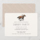 Invitation moderne de fête de derby de course de chevaux avec une illustration d'un cheval de course avec jockey et motif rayé sur le dos. Tous les éléments de texte peuvent être modifiés afin que ce design puisse être utilisé pour d'autres événements également : invitation de mariage équestre chic, fête d'anniversaire de cheval, fête de visionnage de derby, ouverture de manège et plus encore. Le fond, la couleur de l'illustration et les couleurs du texte peuvent être modifiés à l'aide de l'outil de conception !
