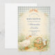 Un design de baby shower charmant de style livre d'histoires mettant en vedette une douce oie aquarelle debout à côté d'un nid rempli d'œufs pastel. Des fleurs printanières délicates et une verdure douce créent une scène de campagne douce, tandis qu'un nœud rose pâle et un fond gingham sauge ajoutent une touche de cottagecore cosy. Le style d'illustration vintage et la palette pastel douce donnent à ce design une atmosphère de nurserie fantaisiste, parfaite pour une célébration de bébé ludique et chaleureuse.