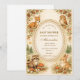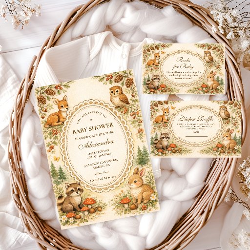 Cette charmante conception de baby shower en milieu boisé présente des animaux de la forêt adorables rassemblés autour d'un délicat cadre vintage, créant une scène chaleureuse de livre d'histoires parfaite pour célébrer l'arrivée prochaine d'un petit. De douces illustrations d'un lapin, d'un raton laveur, d'un écureuil et d'un hibou sont entourées de minuscules champignons, de pommes de pin, de fleurs sauvages et de verdure boisée douce. La palette neutre chaude et le style aquarelle doux donnent au design une atmosphère de nursery cosy et nostalgique, inspirée des illustrations classiques de livres pour enfants. Parfait pour les baby showers sur le thème de la nature, les célébrations en forêt ou les rassemblements rustiques en forêt.