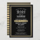 Pouvez-vous garder un secret ? Invitez votre famille et vos amis à une élégante et excitante célébration d'anniversaire surprise avec des invitations de fête personnalisées noires, blanches et avec un faux doré. Tout le texte de ce modèle est simple à personnaliser, y compris le message qui indique "Chut ! C'est une SURPRISE". Le design présente une bordure rayée moderne, une typographie classique vintage Art déco et une calligraphie élégante. Veuillez noter que le doré est une couleur ombrée imprimée, et non une feuille métallique. Félicitations et Joyeux Anniversaire !