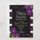 Fête surprise pour 70 ans | Dessin pailleté noir et or avec détail floral violet . Il s'agit d'un modèle prêt à être personnalisé avec les détails de votre fête .