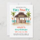 Célébrez l'anniversaire ou une occasion spéciale de votre chiot avec cette invitation de fête pour chiens sur le thème de la plage tropicale "Tiki Pawty". Avec une hutte tiki sur la plage appelée le "Tiki Mutt", un fond d'océan turquoise, des palmiers, une planche de surf, des torches tiki, des jouets à balle et des os. Parfait pour un anniversaire de chien, une journée de jeu pour animaux de compagnie ou une fête au bord de la piscine en été. Œuvre d'art de KL Stock.