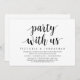 Carte d'invitation de mariage en fuite sur le thème du script moderne (Fêtez avec nous). C'est parfait pour votre dîner de mariage en fuite décontracté au bord du lac, dansant et fête.