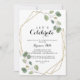 Ce feuillage vert géométrique fêtons l'invitation de la fête est parfait pour une simple fête de fiançailles, bachelorette, retraite, graduation, mariage après la fête ou tout événement ou fête. Le design se compose de branches d'eucalyptus vert botanique dessinées à la main et de feuilles ornant un cadre géométrique doré.