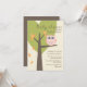 Invitations de douches pour bébés filles, par robe rouge, avec une scène d'automne avec illustration d'arbre vert, tronc d'arbre brun, feuilles feuilles/orange en chute et chouette chouette chouette rosée assise sur une branche brune, imprimée sur un arrière - plan beige/écru.