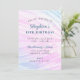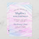 Cette invitation d'anniversaire aux feuilles tropicales peintes est parfaite pour une fête d'anniversaire d'été. Le design présente une texture feuillue tropicale peinte en rose et bleu pour une sensation estivale moderne et amusante.