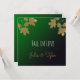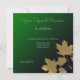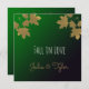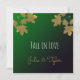 Carte d'invitation carré avec feuilles d'érable doré dans un arrière - plan à gradient émeraude. Il est accompagné d'un texte, "Fall in Love." Invitations ou annonces élégantes pour votre mariage à l'automne ou à l'automne Les deux côtés à customiser! Design modèle par Alma Wad
