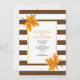 Feuilles d'érable orange et rayures brunes mariage de automne invitation. Cette invitation de mariage d'automne moderne affiche de beaux feuilles d'érable orange avec des veines marron aux coins d'un cadre blanc avec contour or qui tient votre texte. Une bordure motif rayée en brun et blanc la encadre.