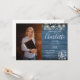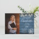 Une invitation à la remise des diplômes rustique avec de jolies lampes à cordes, des jarres en maçon, un nom de style signature et une typographie moderne sur un arrière - plan en bois rustique bleu, personnalisée avec votre grande photo et détails de célébration. Conçu par Thisisnotme©