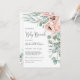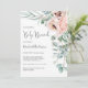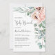 Une invitation de baby brunch féminine et élégante présentant un bouquet dans le coin de coquelicots aquarelles, de roses, d'eucalyptus et de verdure retombante dans des tons pastel beige, rose, vert et vert-bleu. Les associations de polices tendance comprennent un script manuscrit et un élégant serif. Il y a un texte spécial au dos de l'invitation avec une demande "Livres pour bébé". Cette invitation est un excellent choix pour la future maman qui attend une petite fille. Personnalisez le modèle de texte facile à utiliser avec vos informations d'événement.
